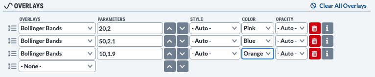 By default, the overlay uses a 20-period SMA and sets the bands 2.0 standard deviations above or below the SMA. These parameters can be adjusted to meet your technical analysis needs.